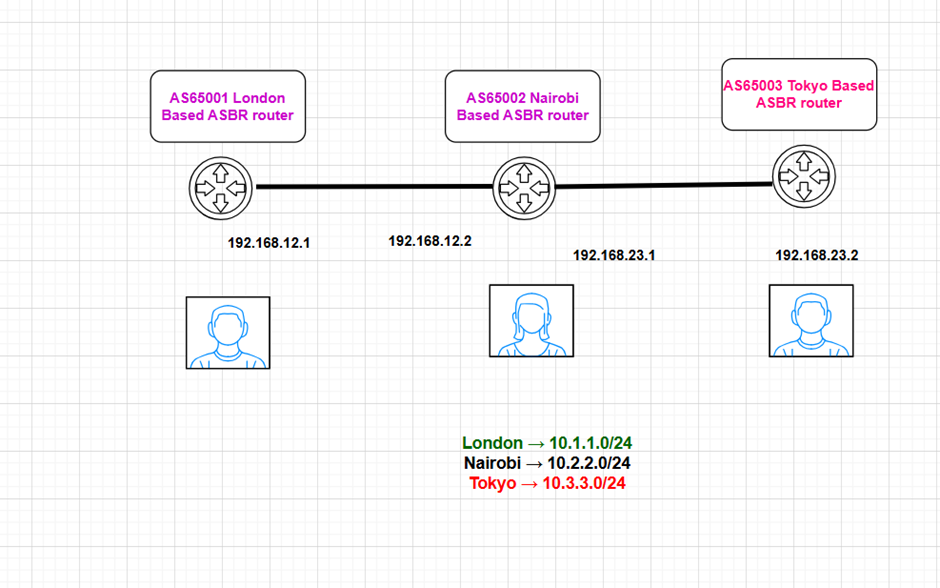 Scenario 1 -- "John works at BT Telecom, where the network consists of Nokia 7220 Linux routers deployed in London within one AS, Cisco 9K series routers operating in Nairobi within another AS, and Juniper MX series routers located in Tokyo in a third AS. Explain how these routers can communicate with each other with using step wise CLI.”