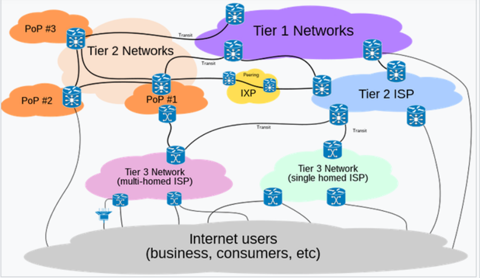 These Tier-2 ISPs then connect to the Transit providers or even further up to Tier-1 ISPs, which form the backbone of the internet and provide the largest networks and global span.