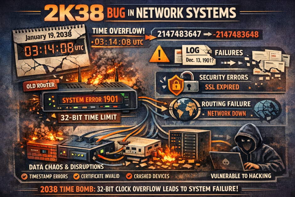 since 1 January 1970, which occurs at 03:14:07 UTC on 19 January 2038; at the very next second, the counter overflows and wraps to a negative value, causing the router to interpret the current time as a date in 1901, and because this corrupted time is immediately used by routing protocol timers, certificate validation, logging, scheduling, and security processes, the bug is effectively “created” at that instant within the router’s timekeeping logic, leading to control-plane errors and network instability.