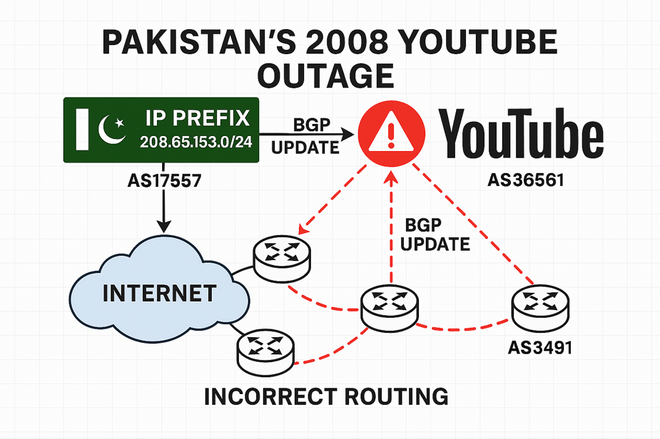 In February 2008 the world saw just how fragile and interconnected the Internet routing system is when Pakistan’s attempt to block YouTube locally ended up taking YouTube down globally. The Pakistani government asked local ISPs to block YouTube due to content, and Pakistan Telecom (AS17557) did so by announcing a false BGP route for YouTube’s IP prefix. This was meant to be a local announcement only but was accidentally propagated to the global Internet by their upstream provider PCCW (AS3491) who accepted and further announced the bogus route to other networks. Since BGP favors the most specific prefix, networks around the world started sending YouTube traffic to Pakistan Telecom and a massive black hole effect took YouTube down for users worldwide. This is often referred to as one of the biggest BGP hijacking incidents in history and showed the trust-based vulnerabilities in BGP, the lack of built in route authentication and the importance of implementing stronger security mechanisms like prefix filtering and RPKI to secure the global Internet.