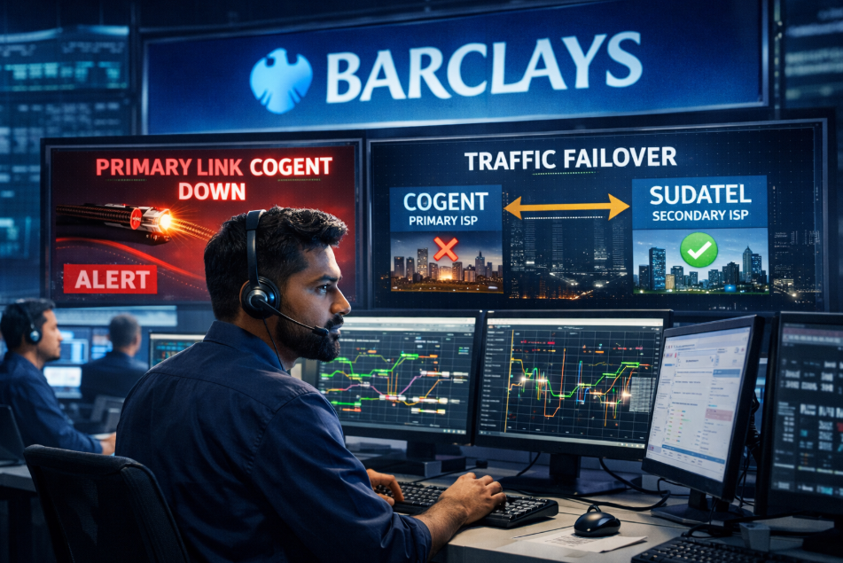 Scenario- Jisanth works as a SOC engineer at Barclays, where he supports critical financial applications running in the backend infrastructure. To ensure high availability and uninterrupted service, the organization uses a dual-ISP setup with Cogent Communications as the primary link and Sudatel Telecom Group as the secondary link.